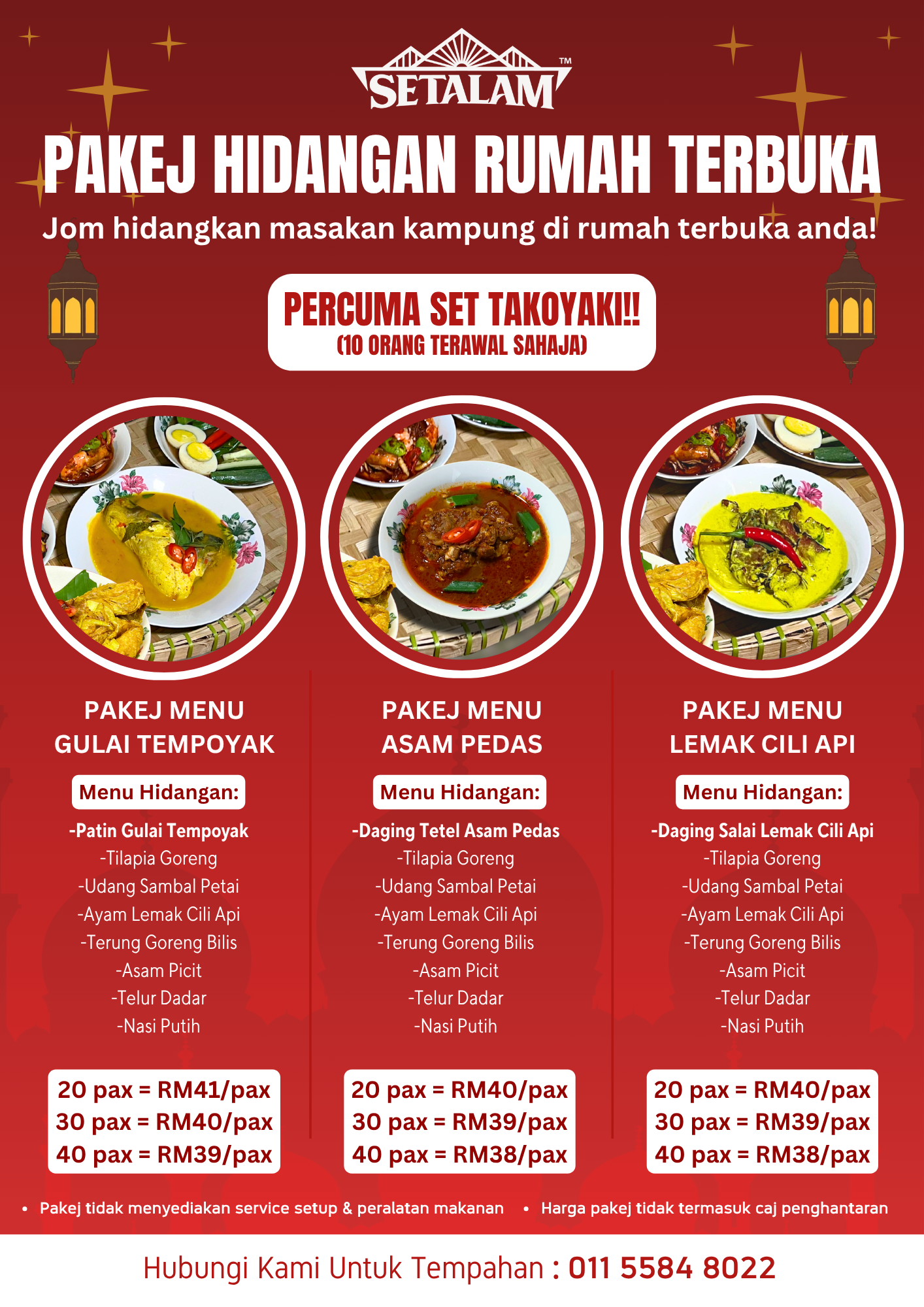 Restoran Setalam™ menyediakan masakan popular kampung seperti Gulai Tempoyak, Asam Pedas dan Masak Lemak Cili Api untuk disajikan di rumah terbuka anda.